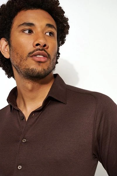 Het overhemd heeft een stijlvolle bruine kleur en is voorzien van lange mouwen en een enkele manchet. Verder is er een 1-knoops, kent boord aanwezig. De Slim-Fit pasvorm zorgt voor een getailleerde afwerking, waar u indien gewenst met gemak nog een T-Shirt onder kunt dragen. Ook erg handig: dit overhemd is volledig strijkvrij!