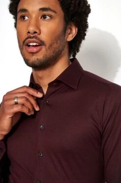 Het overhemd heeft een stijlvolle bordeaux kleur en is voorzien van lange mouwen en een enkele manchet. Verder is er een 1-knoops, kent boord aanwezig. De Slim-Fit pasvorm zorgt voor een getailleerde afwerking, waar u indien gewenst met gemak nog een T-Shirt onder kunt dragen. Ook erg handig: dit overhemd is volledig strijkvrij!