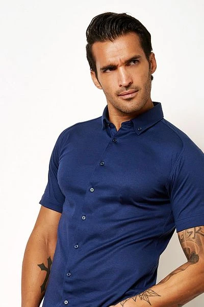 Dit zwarte overhemd van het trendy merk Desoto is een musthave voor elke fashionable man. Dit overhemd heeft een slanke pasvorm en is afgewerkt met een jersey binding, button down kraag en korte mouwen. Doordat dit herenoverhemd gemaakt is van jersey katoen biedt dit shirt extra rekbaarheid en meer bewegingsruimte. Het jersey katoen is bovendien op een hoogwaardige manier gebreid en de stoffen zijn Oeko-Tex gecertificeerd.