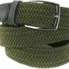 Deze elastische riem met geweven patroon is aan de uiteinde voorzien van een leren stukje. De gesp is zilver gekleurd en heeft een vierkante vorm met mooie rondingen. De breedte van deze riem is 3,5 cm.