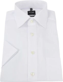 Met dit witgekleurde overhemd uit de Luxor Modern-Fit collectie van Olymp haal je een casual variant van het klassieke witte dress-shirt in huis. Het overhemd is afgewerkt met korte mouwen, een traditionele kent boord en een borstzakje met een ton sur ton borduursel.