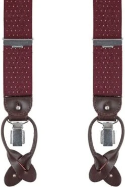 Luxe bordeaux-rode bretels afgewerkt met wit van het Nederlandse merk Profuomo. De bretels hebben zowel leertjes (patten) als klemsluitingen, deze kunt u verwijderen zodat u de bevestiging van uw keuze kunt dragen. De bretels worden geleverd inclusief bijpassende bretelknopen die u aan uw broek kunt bevestigen.