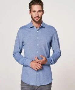 Dit Knitted overhemd is uitgevoerd in een stijlvolle blauwe kleur en voorzien van een subtiel melange dessin, modische cutaway boord en enkele manchetten. Dit zorgt ervoor dat het dress-shirt een moderne look krijgt en je outfit voorziet van een trendy touch.