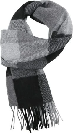 De zachte heren sjaal van Suitable heeft een kleurenpalet van grijs, antraciet en zwart en door zijn lengte op vele manieren te dragen. De sjaal heeft een ruit dessin met op de uiteindes franjes.