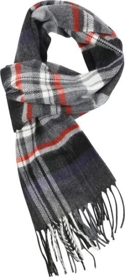 De zachte heren sjaal van Suitable heeft een grijze kleur met zwarte en rode tinten en door zijn lengte op vele manieren te dragen. De sjaal heeft een ruit dessin met op de uiteindes franjes.