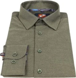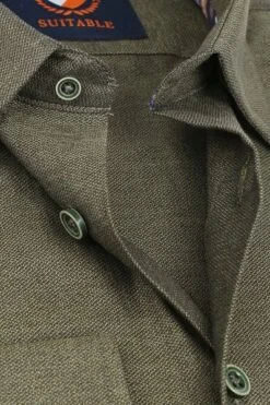 Met dit overhemd van Suitable haal je een casual dress-shirt in huis die je outfit een modische twist geeft. Het herenshirt heeft een stijlvolle donkergroene ‘Forrest’ kleur in een twill binding en is voorzien met een moderne print op de boord en in de manchetten, die zorgt voor een vrolijke en trendy uitstraling. Daarnaast is het overhemd voorzien van een casual hidden button down (HBD) boord, enkele manchetten en bijpassende bruine knopen.