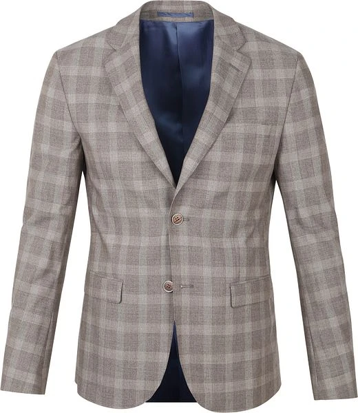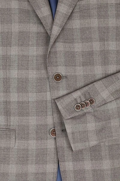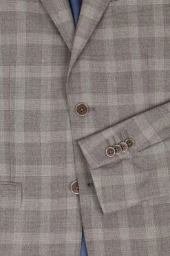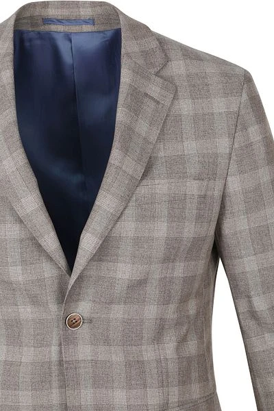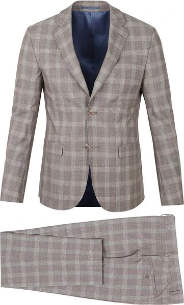 Met dit Strato kostuum van Suitable kom je tijdens elke gelegenheid goed voor de dag. Naast comfortabel en van hoge kwaliteit is het herenpak ook nog bijzonder modieus. Het kostuum heeft een stijlvolle beige ‘zandkleur en is voorzien van een stijlvol ruiten dessin met enkele licht- en donkergrijze tinten. Het colbert is afgewerkt met een notched revers, een dubbele split, twee klepzakken, een borstzak en maar drie binnenzakken. De stijlvolle pantalon is voorzien van een schuifknoop- en ritssluiting, twee steekzakken aan de voorzijde en twee broekzakken met knoopsluiting aan de achterzijde.